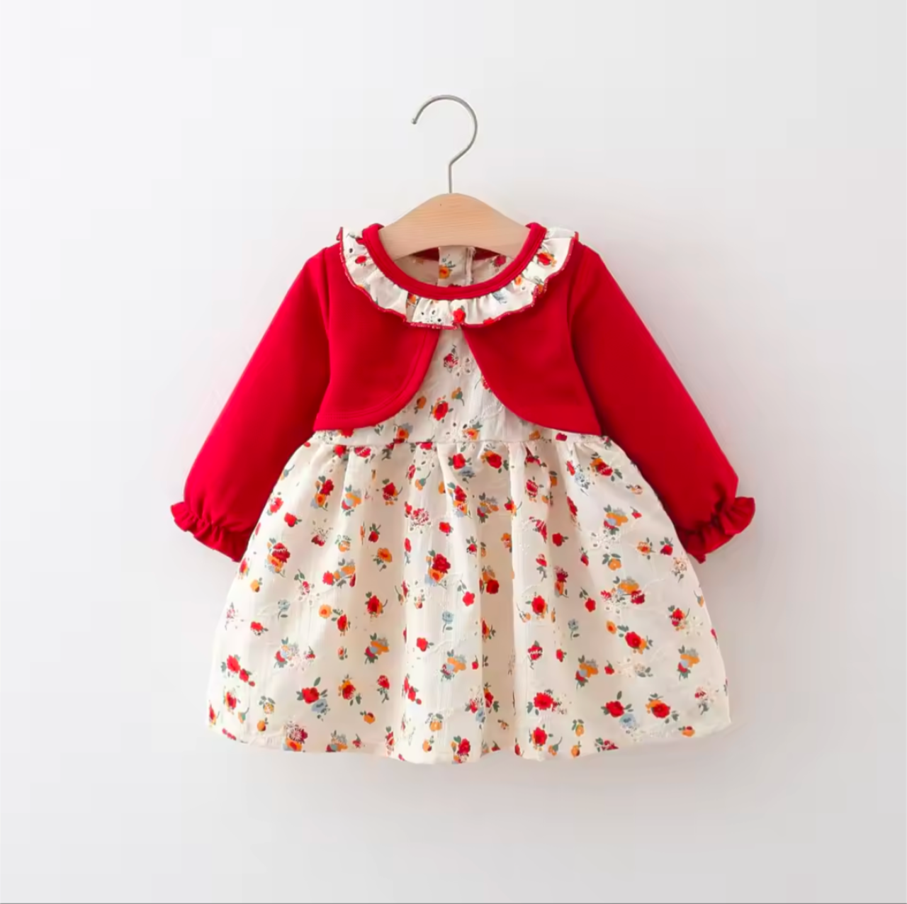 赤いボレロを羽織ったように見えるデザインが特徴の長袖ワンピースです。