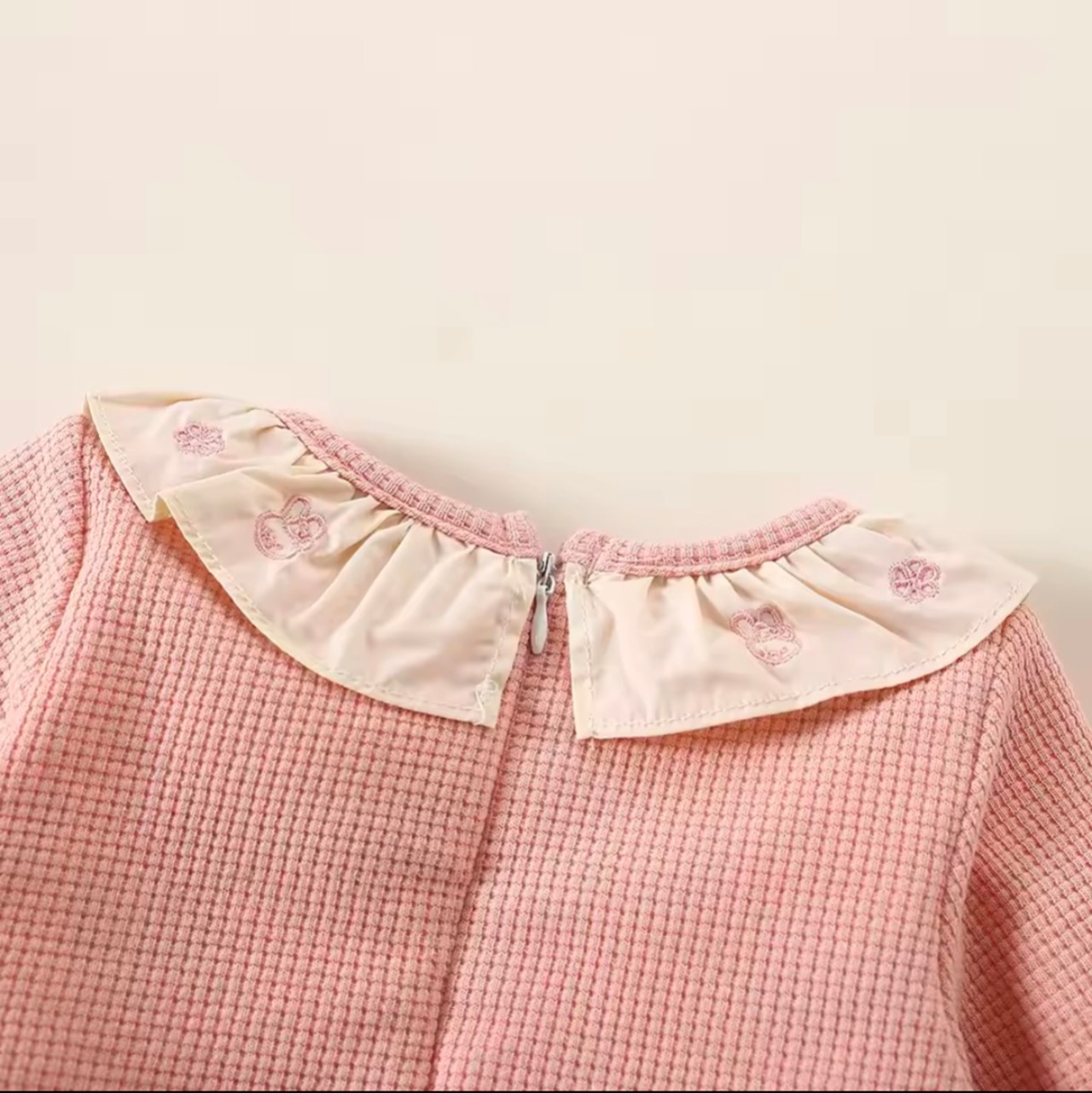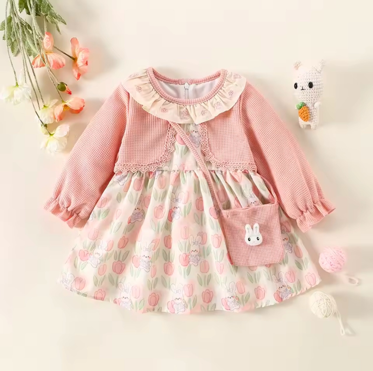襟元のフリルや袖口のギャザーが女の子らしさを引き立て、付属のうさぎポシェットがコーディネートのアクセントに。