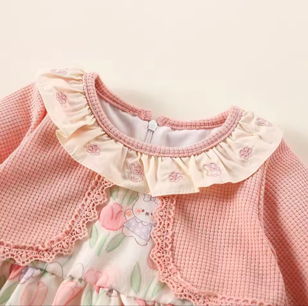 スカート部分にはチューリップとウサギの総柄プリントが施され、春らしい優しい雰囲気に仕上がっています。